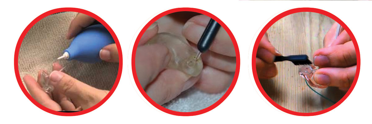 Arra mindig ügyeljünk, hogy ha a tisztítás nedvességgel jár, mindig vegyük le az illesztéket a hallókészülékről és úgy tisztítsuk, nehogy nedvesség jusson a gépházba a csövön keresztül. Várjuk meg, míg az illeszték kiszárad, és csak utána helyezzük vissza. Ezt a folyamatot erre a célra kifejlesztett pumpával felgyorsíthatjuk. A levegő bepumpálásával gyorsan eltávolíthatunk minden nedvességet.